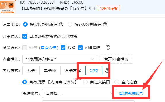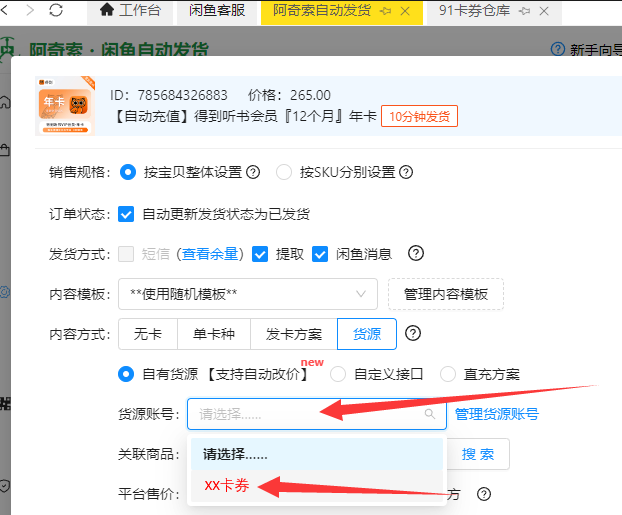 12.回到自动发货处,货源账号选择“XX卡券” ,也就是你上面添加的货源账号