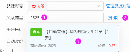 13.关联商品处填写您上架的宝贝,在货源网站上的商品编号,填完点击搜索,再点击出现的商品信息③。