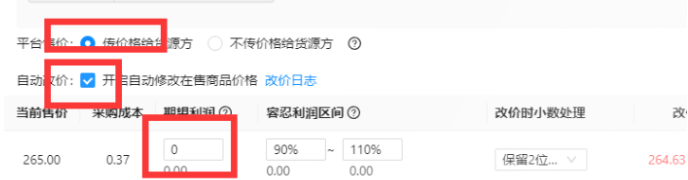 14.勾选传价格给货源方、勾选开启自动修改价格,填写您想要的利润,然后点保存
