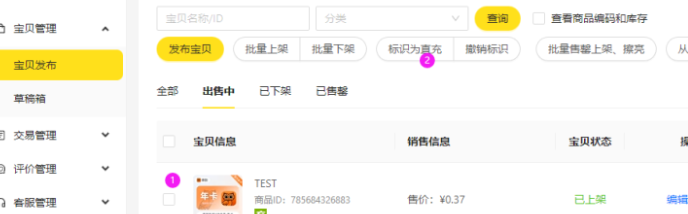 16.回到工作台-宝贝发布-勾选刚刚设置过的宝贝,点击②标识为直充