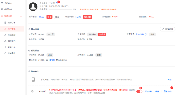 5.在深度-账户管理界面,查看您的会员编号(Appkey)和API密钥(Appsecret )